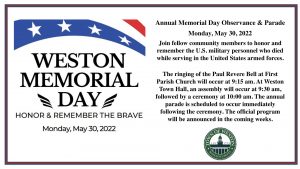 The ringing of the Paul Revere Bell at First Parish Church will occur at 9:15 AM. At Weston Town Hall, an assembly will occur at 9:30 AM, followed by a ceremony at 10:00 AM. The annual parade is scheduled to occur immediately following the ceremony. The official program will be announced in the coming weeks.